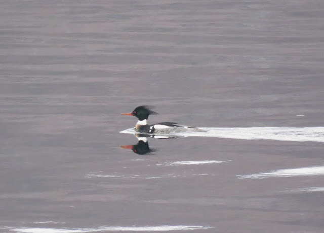 On a very cold walk (just below freezing) round the usual haunts, I heard the eerie, wavering call ("tremolo" I think) of a distant great northern diver. Some shags were showing breeding tufts, and a male merganser was also looking quite dressy.