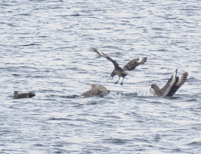 I think I chose the wrong day. Early on the horizon was obliterated by haar - and even when the mist eventually cleared, there was a milky quality to the air and sea. Looking to my left (south) was pointless thanks to the intense sparkling of the water in the sun, and even when I did see something mildly interesting straight out, it was almost impossible to locate it through the camera viewfinder. A solitary porpoise snorkelling its way through a bunch of shags cheered me temporarily; and it was heartening to see a bonxie, even if it was feeding on something in the water that looked like a dead auk. But when there was a sudden burst of action involving a juvenile kittiwake and the bonxie (at least, I think it's a great skua though it could be a dark form Arctic), I just clicked away in their general direction without realising until I got home that an Arctic skua had also been present.