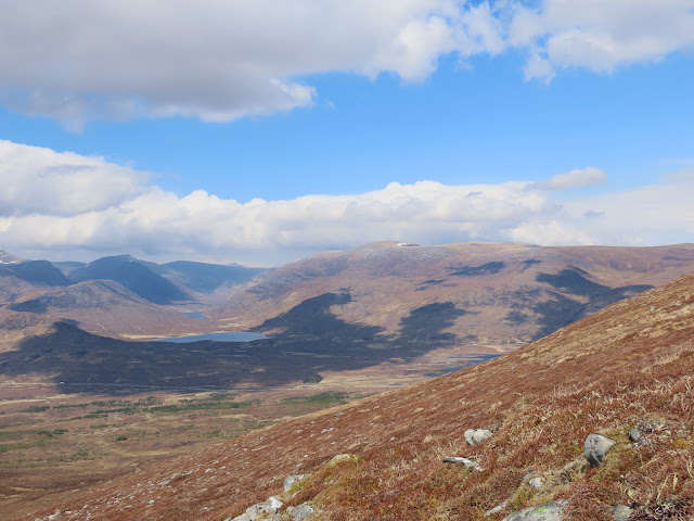 Greger felt well enough to resume his Spanish class today, so I decided to go up this Corbett for the tenth time. Seems a bit mad, but the hill is a good bet for finding ptarmigan - and I also wanted to see if I could still get up a hill (and back down, of course). A wheatear, a golden plover, and several meadow pipits were seen in the distance on the ascent. It was a warm sunny day and very hard going, but I finally reached the summit shelter and collapsed in it to eat my lunch and drink loads of water (some Fannichs in the background).